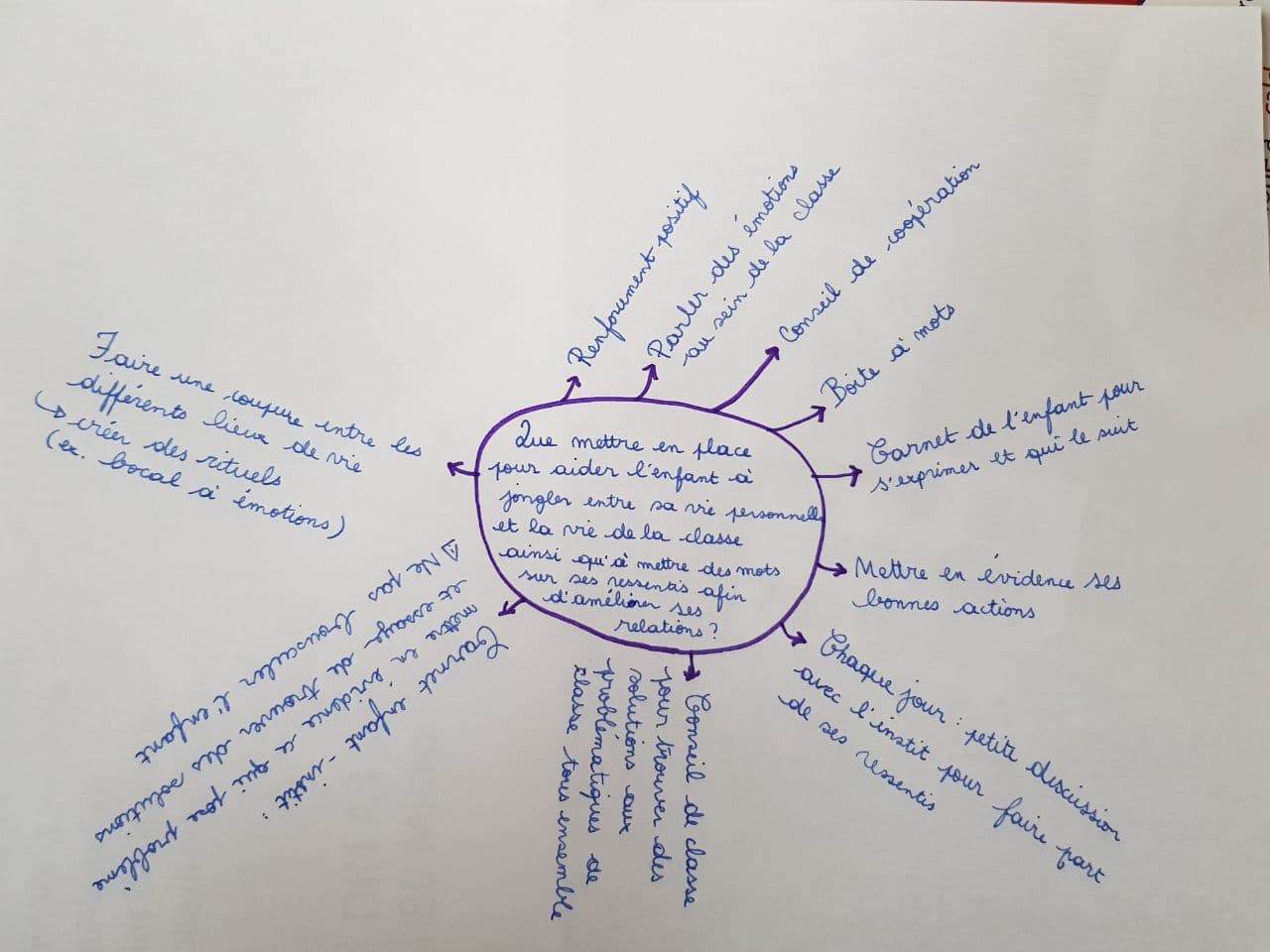 Le premier séminaire fut très intéressant au niveau de la réflexivité et des pistes envisagées autour de la question suivante : Que mettre en place pour aider l'enfant à jongler entre sa vie personnelle et le contexte de la classe ainsi qu'à mettre des mots sur ses ressentis afin d'améliorer ses relations?